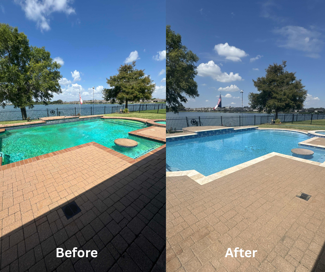 We clean the jobsite completely before leaving and use durable materials designed to hold up under Houston weather. The deck may need to cure for 24 to 48 hours depending on the coating used, and we provide specific care instructions before we finish. This service does not include pool equipment upgrades or landscaping changes, but it does prepare your backyard for long-term use without ongoing surface problems.